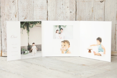 写真をお値打ちにアルバムで残したい方にお勧め! 厳選した4〜5カットのお写真を 1冊ずつ丁寧にデザイナーがレイアウト 3面見開きタイプで 立てかけて飾る事もできます